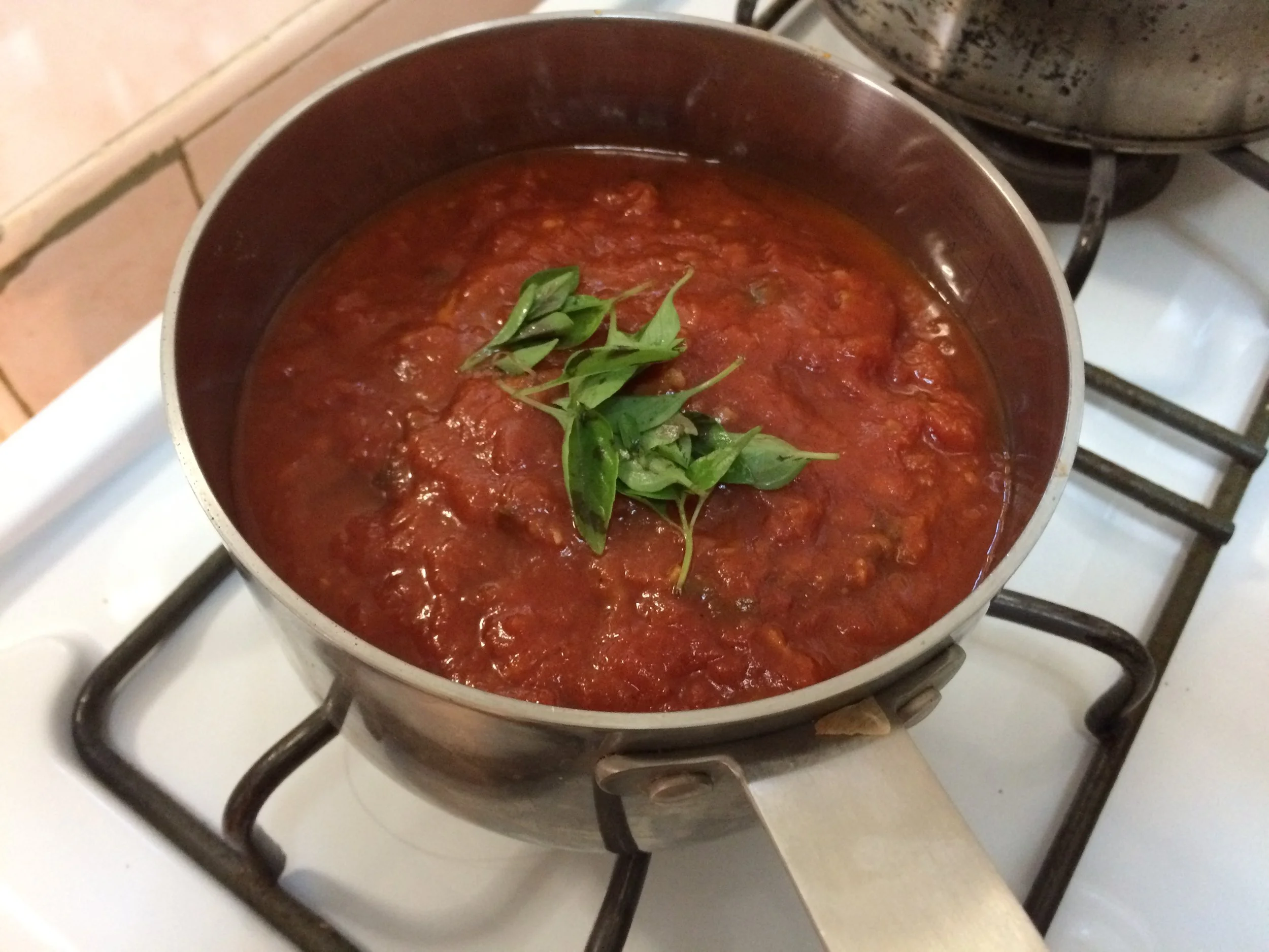 My kids love this sauce, and it’s versatile. They will eat it with any shape of pasta, tortellini, or ravioli. I spread it over my homemade pizza dough. It goes into my chicken and eggplant parmigiana, two more kid-friendly dishes. I use the sauce as a dip, to go with bread and fried calamari. In an emergency, if the kids are hungry and picky, I can reach into the freezer, pull out some homemade English muffins, top them with the sauce and grated cheese, and toast it all for a quick meal.