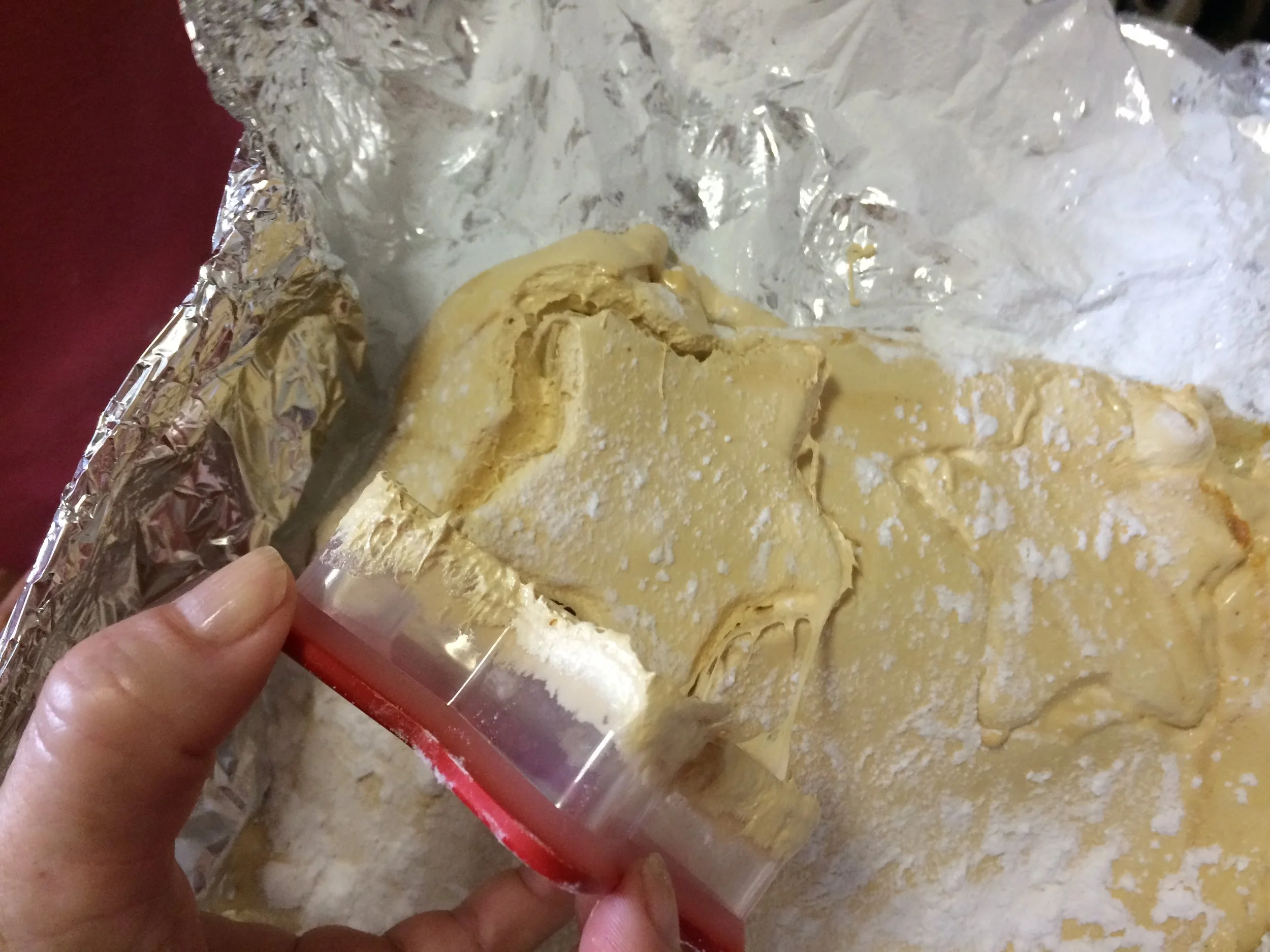 Place the cornstarch and confectioner’s sugar in a glass jar, replace the cap tightly, and shake well. Line the baking dish with aluminum foil. Brush the foil with oil. Sprinkle the foil with a few tablespoons of the cornstarch-sugar mixture, making sure to cover the bottom of the pan evenly.