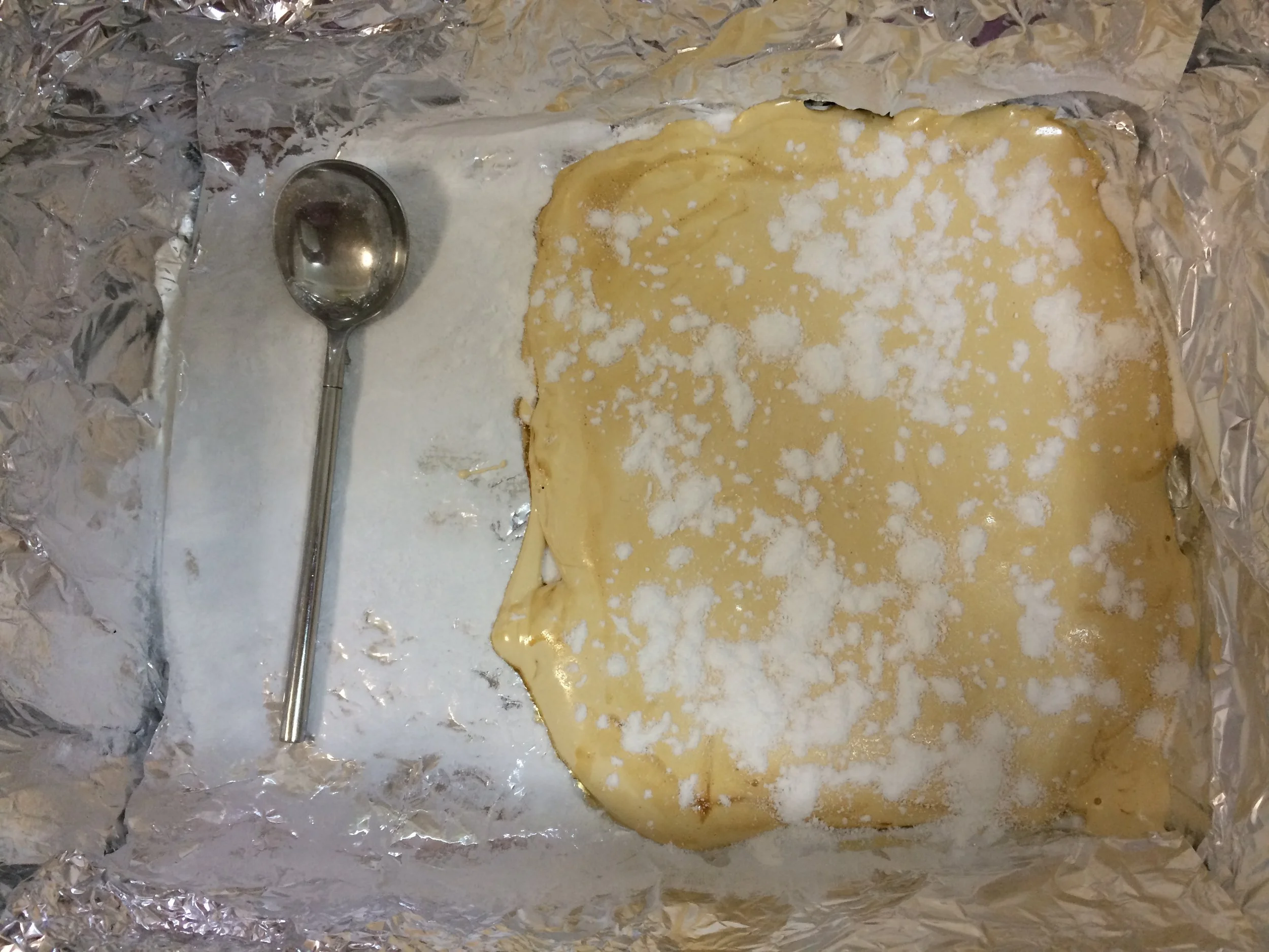 Transfer the batter into the prepared dish. This is the most difficult part of the recipe! The batter will be very sticky and adhere to most surfaces. I found that metal butter knives are the easiest instruments to work with. Once you get the batter into the dish, dip a metal knife into cold water for 10 seconds, then use it to spread the batter evenly in the dish. Set it aside, uncovered, overnight.