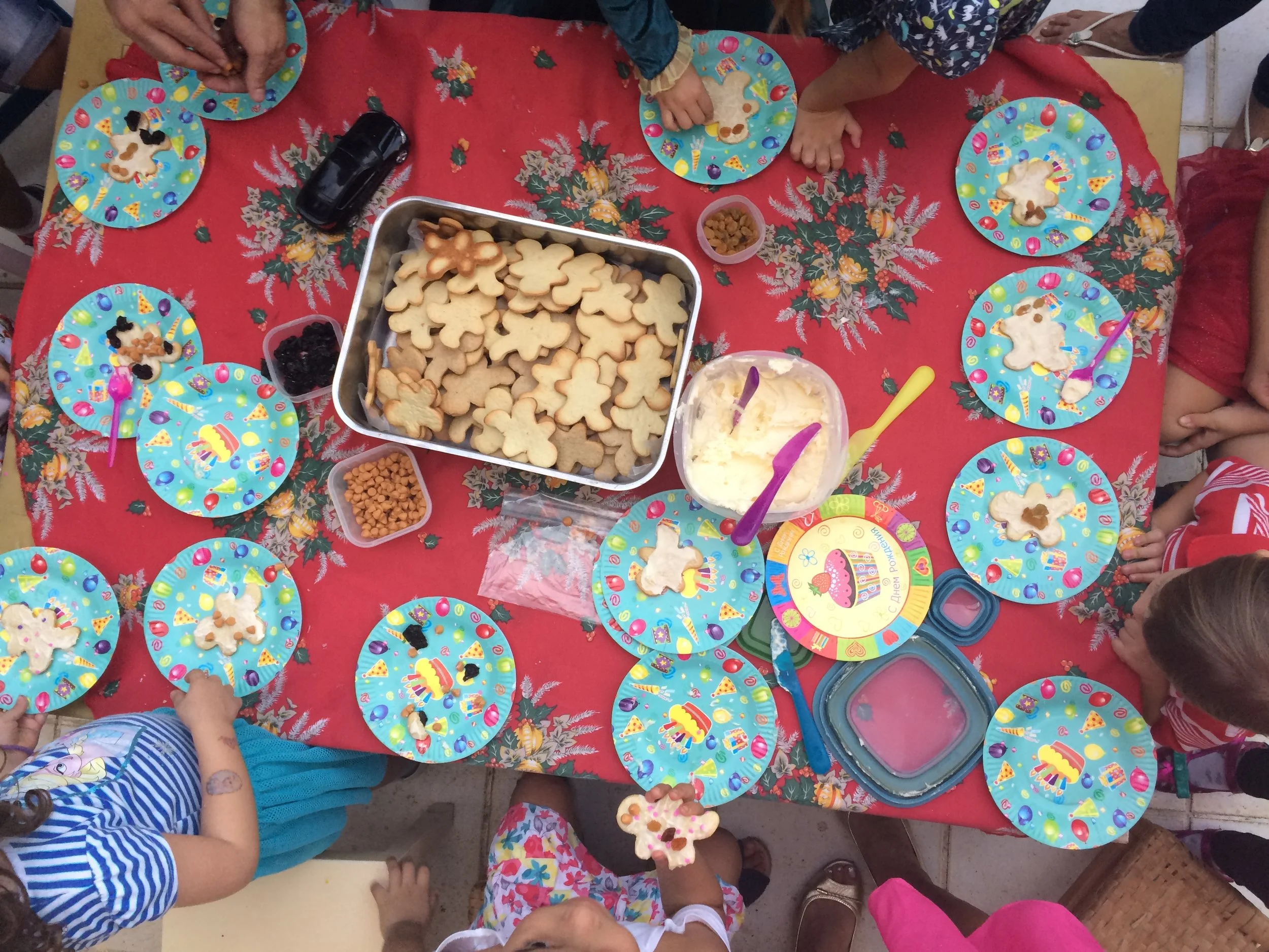 The cream cheese frosting goes on most of my cakes, and here, it provided an easy way for the kids to participate in the cookie making. We don’t have much in terms of candy in Cuba, but I dug through our pantry and found half-eaten bags of raisins and dried cranberries. A friend donated sprinkles. They were a hit at my daughter’s school Christmas party, where the cookie decorating competed with a visit from Santa, peacocks, a puppet show, and pony rides.