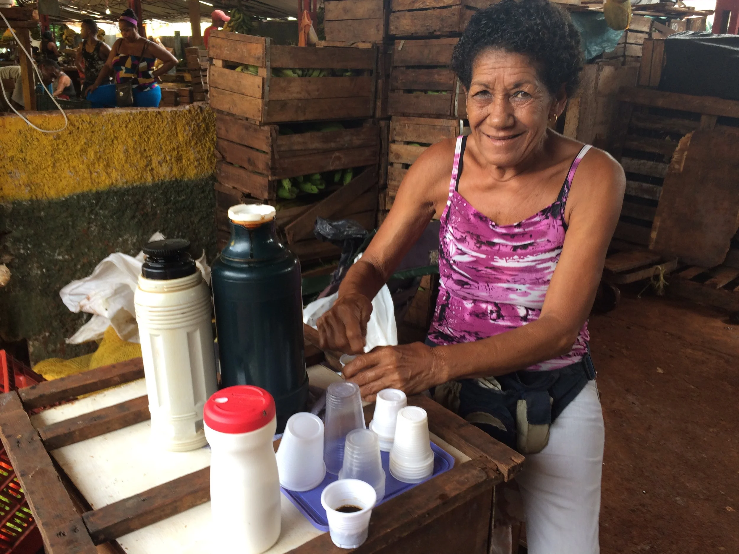 A retired lady at the back of the market sells good espresso, from a thermos and sold in rare plastic cups that she reuses. She tells me she gets her coffee from her relatives in the Oriente (the east of the island) who mail it to her to supplement her paltry pension of less than $10 per month (this is one example of inventing). A cup of her espresso costs 1 Cuban peso, or 5 cents. At the end of my shopping trip, I need a jolt of caffeine to carry everything back to the trunk of my car!